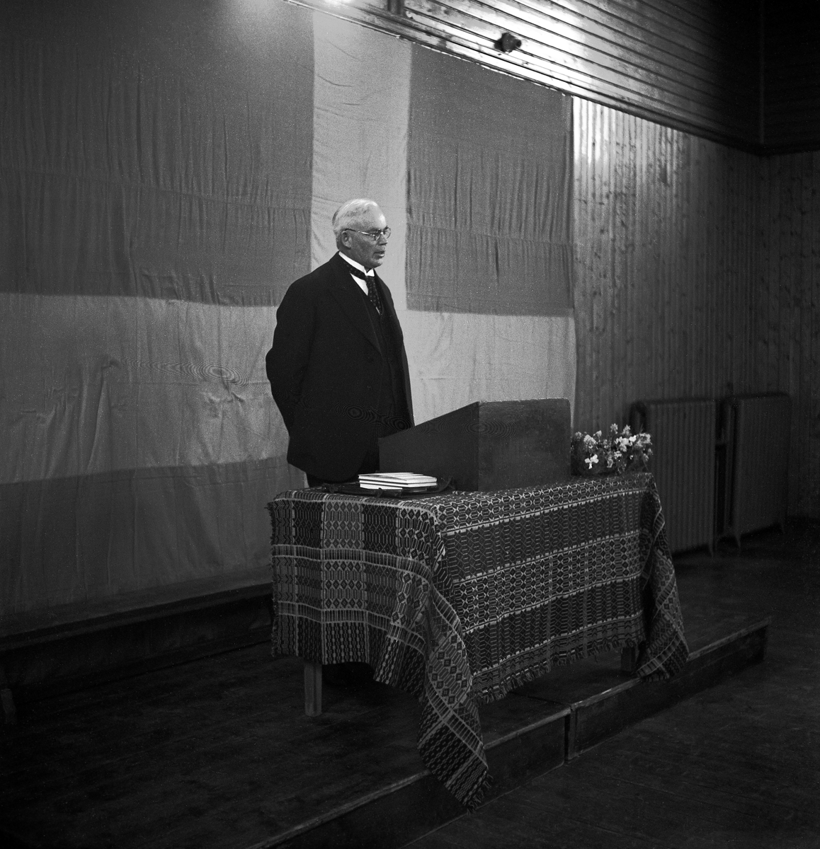 En äldre man i glasögon och kostym, talar vid katedern/talarstolen i