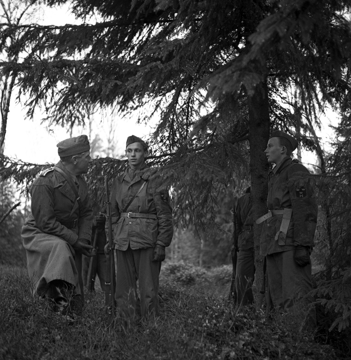 Några hemvärnssoldater diskuterar något under en stor gran.