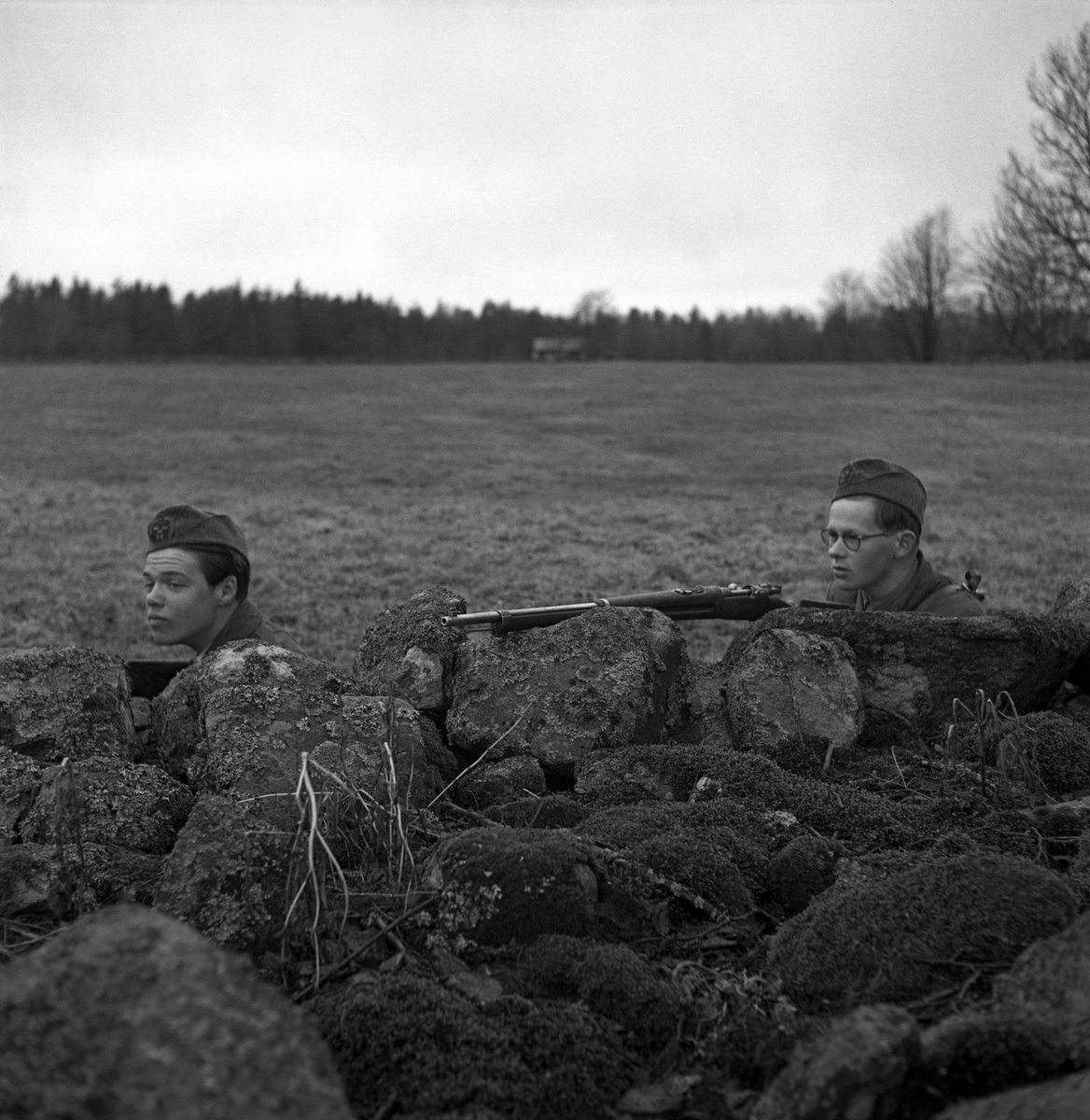 Några hemvärnssoldater har lagt sig i skydd bakom en