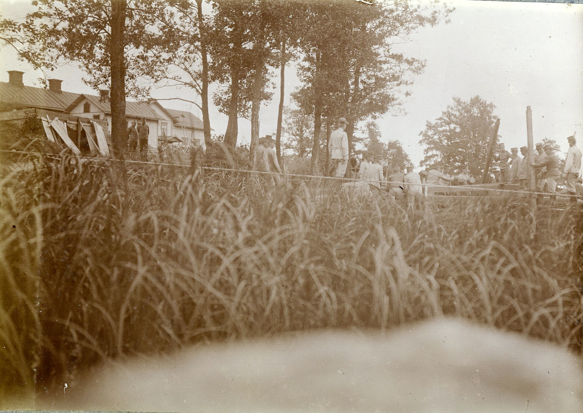Titel: Svea ingenjörkår, Ing 1. Laxön år 1908. Byggnation av flytande bro.