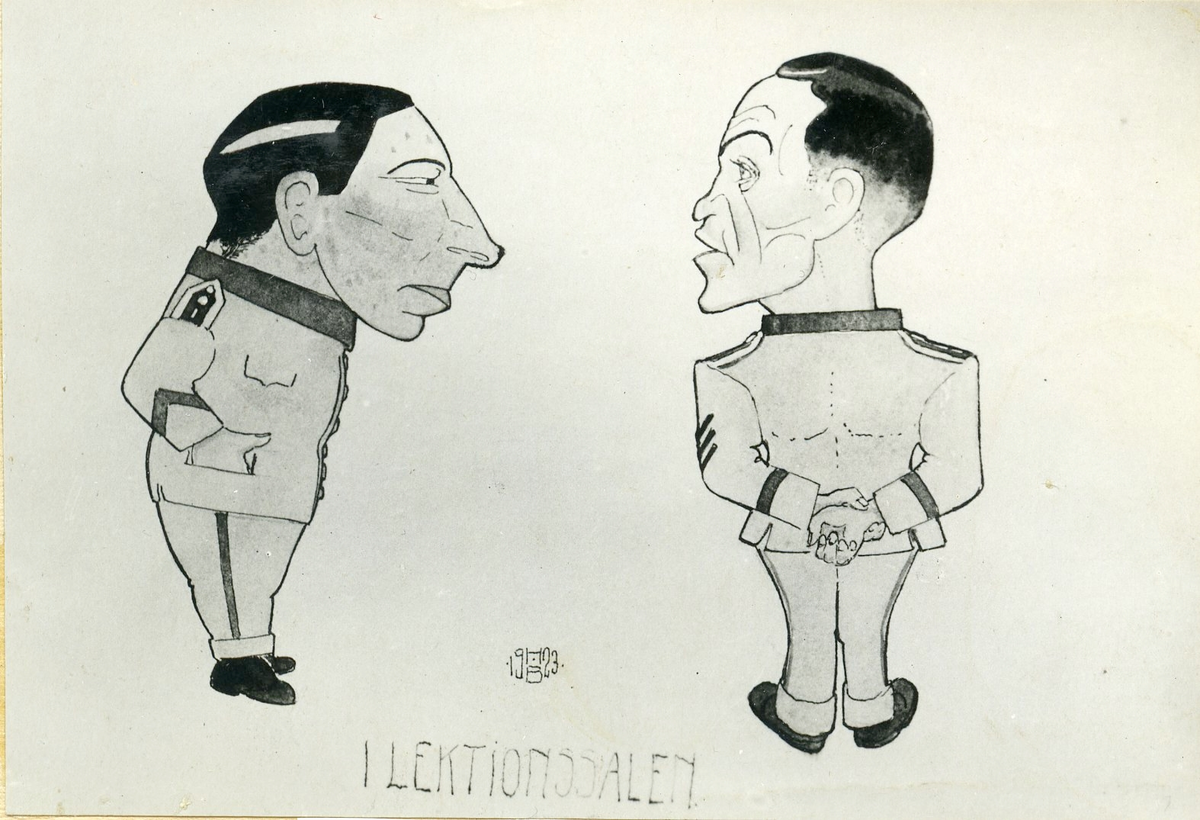 Svea ingenjörkår, Ing 1. Foto från 1920-talet. Tecknad karikatyr "I lektionssalen", Wendel och Printz.