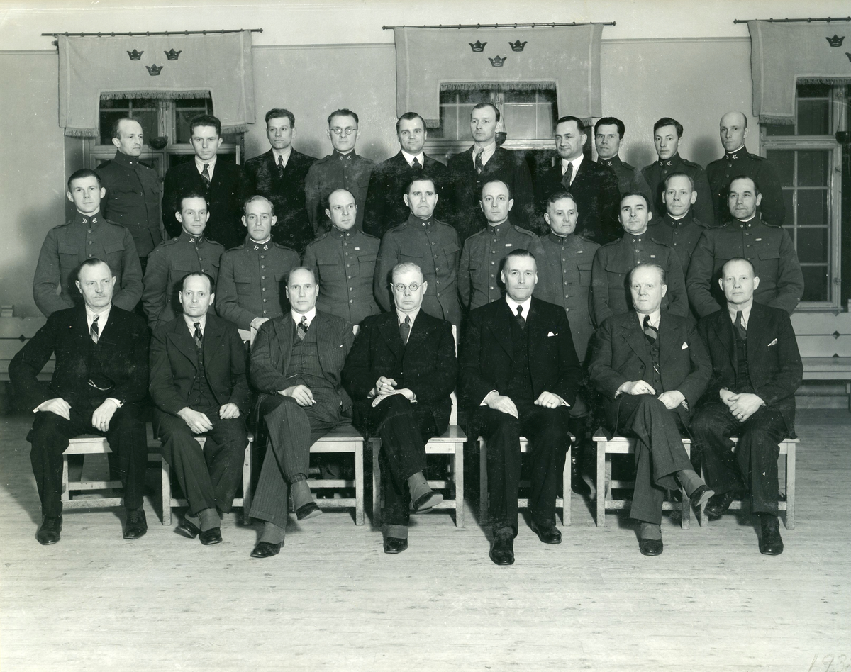 Svea ingenjörkår, Ing 1. Föredrag och ärtmiddag på underofficersmässen 21 april 1938. Bakre raden fr v: P S Sandering, G Åkesson, B Lilliestrand, O H Schreiter, R E Frigghe (Fort.), S Hjertqvist, F Abrahamsson (Fort.), J G Bergman, H S Johansson, L Ohlsson. Mellersta raden fr v: G V Hansson, T F Jönsson, T O Krona, W Nyström, C H Kihlberg, C R A Liedbeck, E A Stockeld, G H Åberg, R V Forsklint, G R Thyrstedt. Främre raden fr v: C J Hejmar, J Klintholm, A E Ternbom, H O Cederbom, Redaktör F Josephson, J O Blomgren, C O V Kall (S 1).