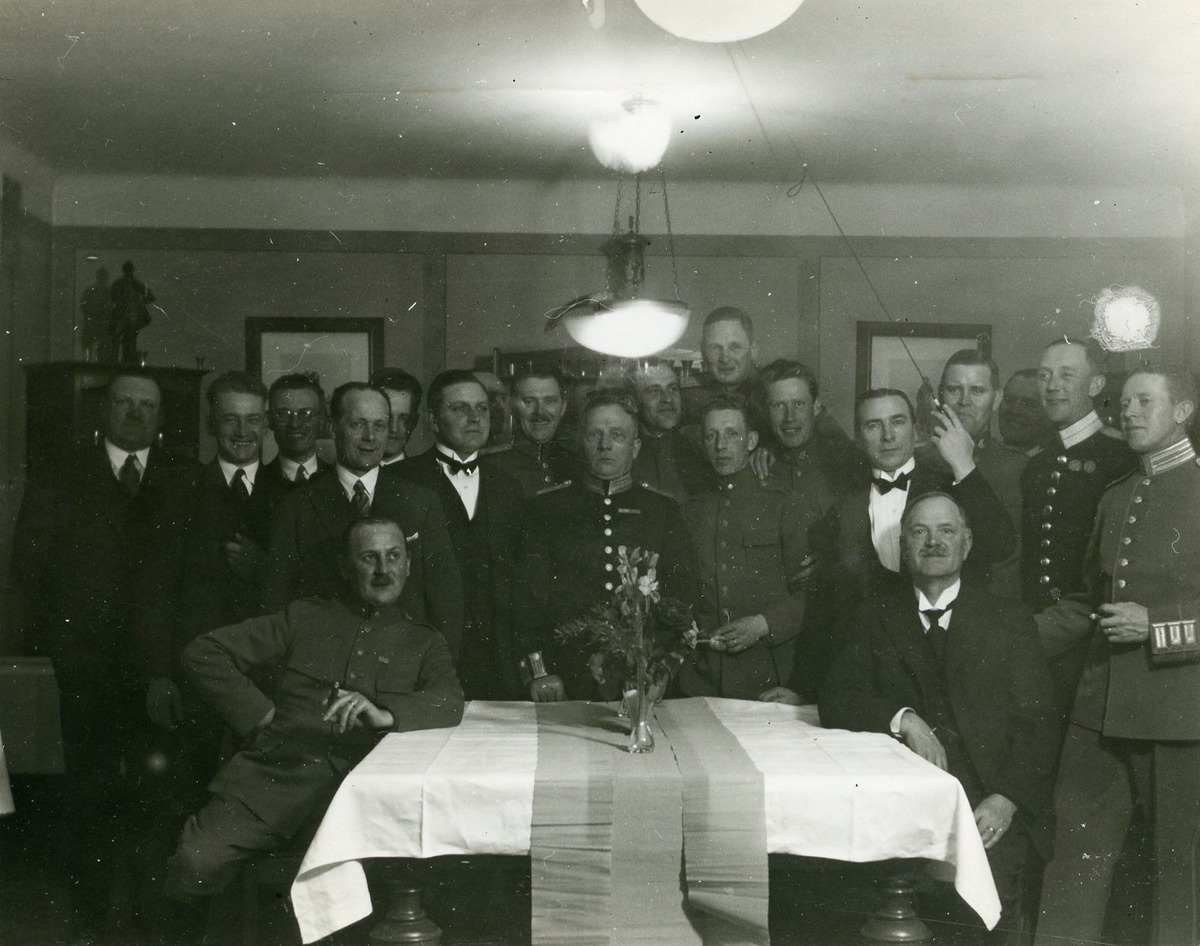 Svea ingenjörkår, Ing 1. Förvaltare Ljungmans 60-årsdag, april 1934. Sittande fr v: Kerslow, Quist. Stående fr v: Andersson, Gerle, Schreiter, Klintholm, Magnusson, Johansson, Liedbeck, Gåde, Ljungman, C A P Carlsson, Eriksson, Bengtsson, Karlsson, Åberg, Kihlberg, Bengtsson, Bjurfors (I 2), Skoog.