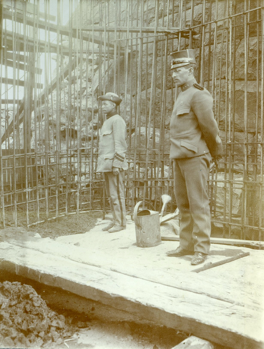 Svea ingenjörkår, Ing 1. "Befästningsarbeten i Karlskrona 1910". Byggnation av värn. Armeringsjärn. Oidentifierade militärer, närmast en kapten i uniform m/ä, i bakgrunden en vicekorpral i uniform m/1906.