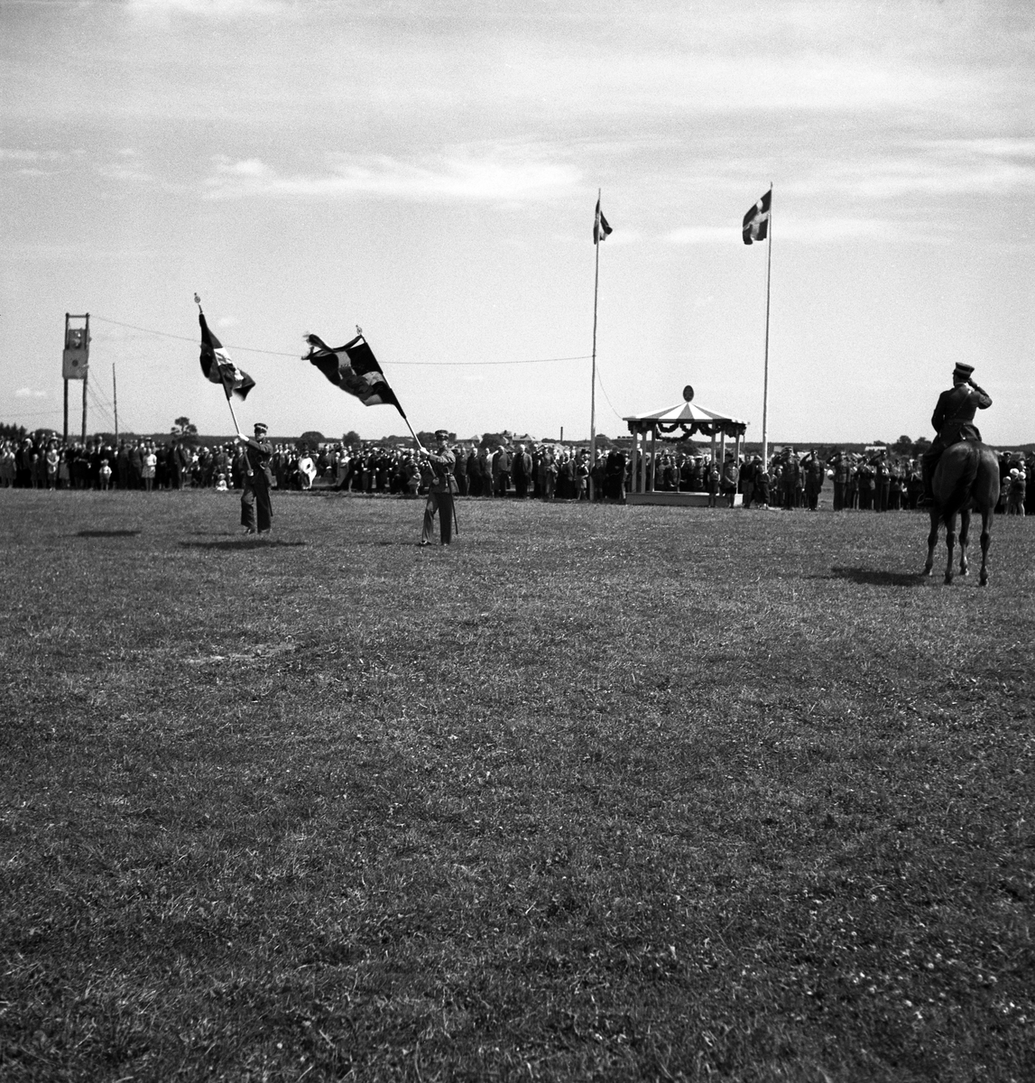 Kamratmötet, I 11. Samling på övningsfältet. Hälsande med fanor framför tribunen.