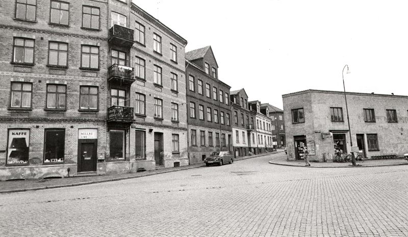 En bild av små äldre fastigheter och ett större bostadshus