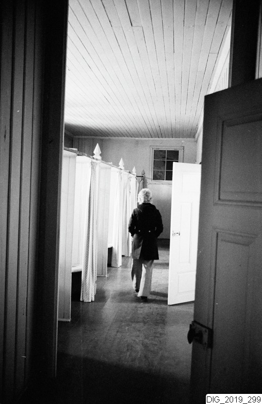 Bilden föreställer Badhuset, Ramlösa Brunn. En korridor med drapperier till vänster och vägg med dörrar till höger. En person går i korridoren.