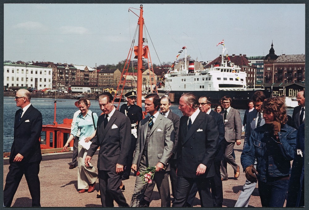 Kungen kommer gående på kajen i Helsingborgs hamn. Han är omgiven av mestadels män och en kvinna. I bakgrunden hamnen med färja och centrum av stadens bebyggelse
