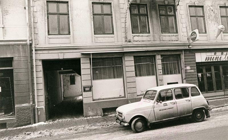Bilden visar gatufasaden på Södra Storgatan 11, år 1972. Till höger syns ingången till en butik vars namn börja på "Mini" som har inskrivna namn på olika maträtter, som t. ex. :fiskfiléer, pommesfrites, hamburgare, korv- mos, glass, mm. Ovanför affärens ingång syns en reklamskylt med texten: "Drick CocaCola." En firmabil med texten "AB Olson & Wright" syns parkerad vid trottoaren.