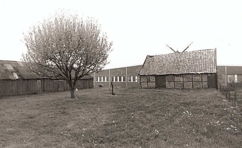 Bilden visar fastighetens båda uthus, det i trä illa medfaret och entt mindre i trä och tegel. Kvarnvingar skymtar bakom det mindre av husen.