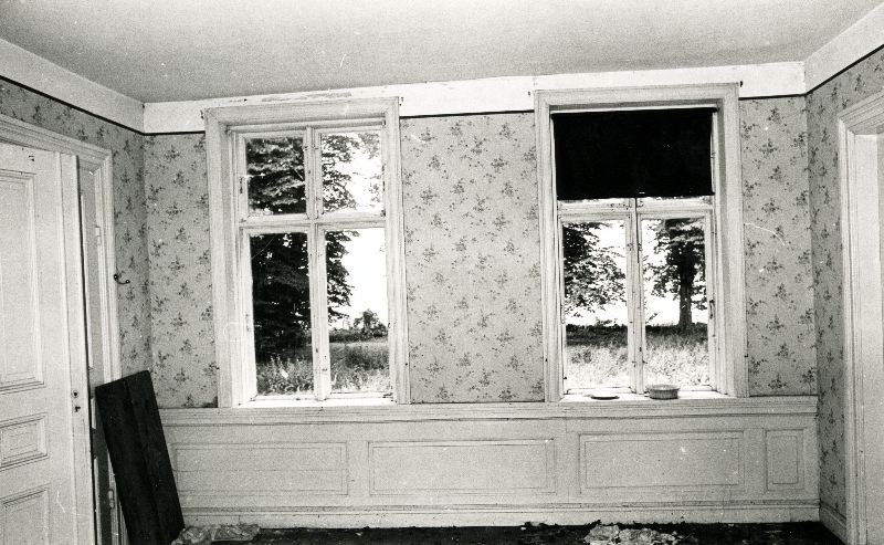En bild av ett rum på norra sidan, andra rummet från vänster, rummet har blommiga tapeter och två fönster, gården heter Pilshult. Fotot från norr.
