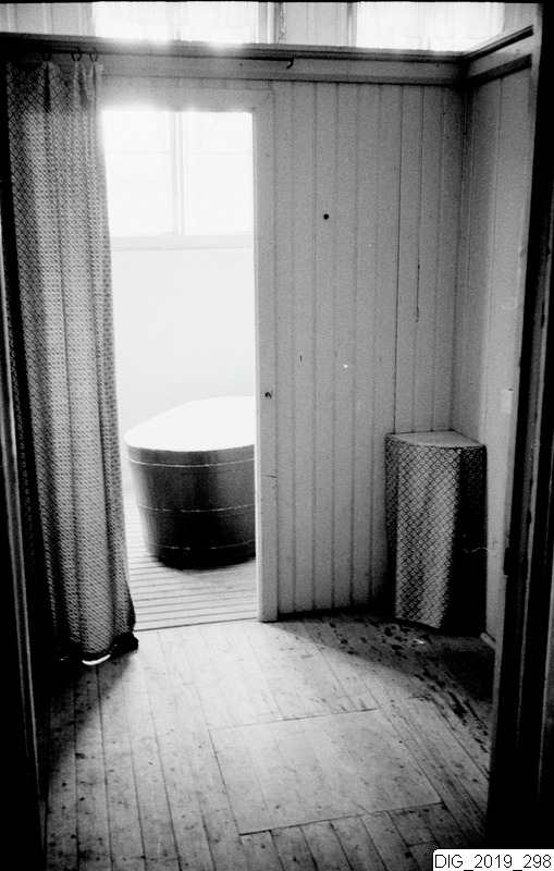 Bilden föreställer Badhuset, Ramlösa Brunn. I bakgrundeneEn badtunna stående i ett utrymme med trätrall på golvet, avskiljs med drapperi. I förgrunden omklädningsrum med trägolv.