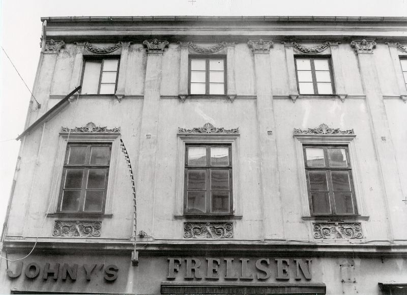 Södra Storgatan 13, Kv. Kärnan södra 7, Helsingborg, före rivningen 1974. Två stycken affärsskyltar med namnen Johny's och Frellsen finns på huset.