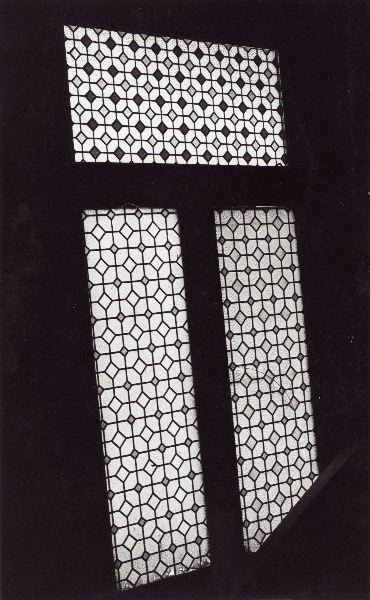 Bilden visar ett trappfönster på Södra Storgatan 11. På bilden syns ett fönster som troligtvis är målat i olika geometriska figurer (romber, hexagoner och linjer) med färgad mosaik.