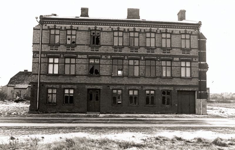 Friliggande flerfamiljsfastighet med krossade rutor. Väg framför.