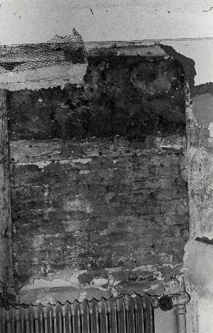 svartvitt fotografi föreställande en mellanvägg av korsvirke, lersten och lerklinkning. Kvarter Fiskaren, Kullagatan 39. Från 1974