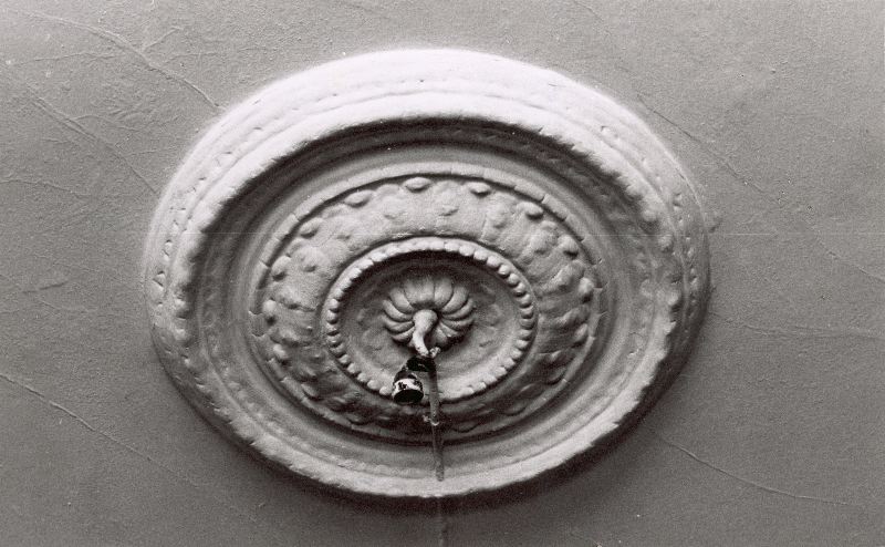 Bilden visar en takstuckatur på Södra Storgatan 11. På bilden syns en takstuckatur rund formad, med både indragna och utskjutna ornament av traditionella motiv.