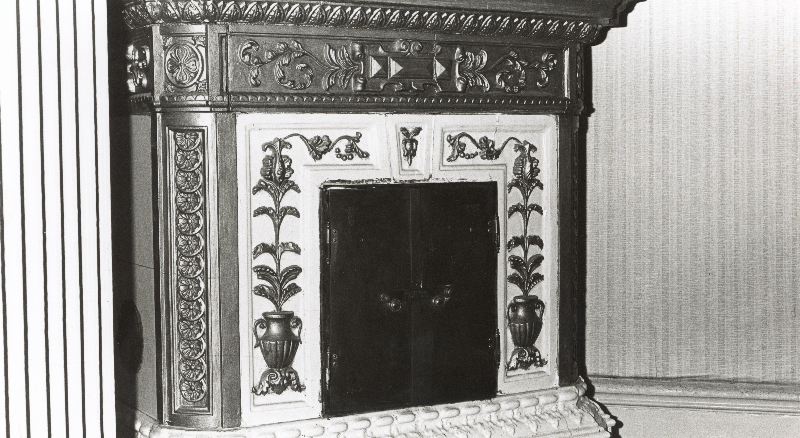 Detaljbild av en kakelugns nedersta del, på Södra Storgatan 11. På bilden syns kakelugnens nedersta del med rektangulär vit sockel och dörrar av gjutjärn med mörka blomstermotiv.