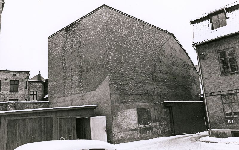 Bilden visar gatuhusets norra gavel, på S Storgatan 9, år 1972. I mitten syns gaveln av ett gatuhus. Vid sidan om till vänster syns en flygelbyggnad och till höger syns hörna på en tvåvåningsbyggnad. I bakgrunden till vänster syns andra byggnader.