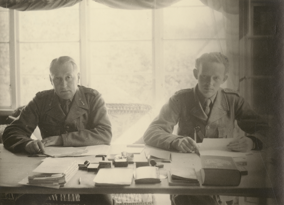 Artillerist och trängsoldat vid skrivbord, uniform m/1939.