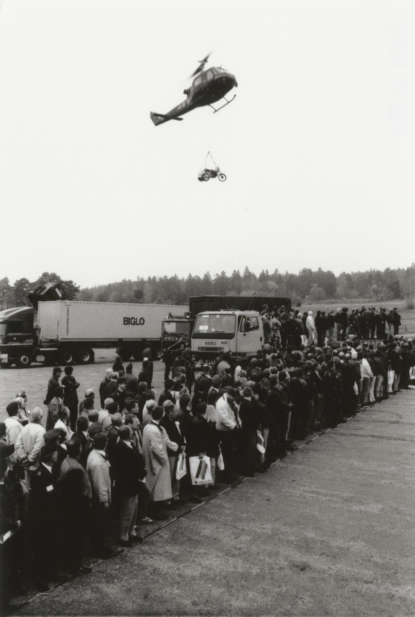 Försvarets helikopter HKP 3 transporterar en motorcykel hängande i rep.