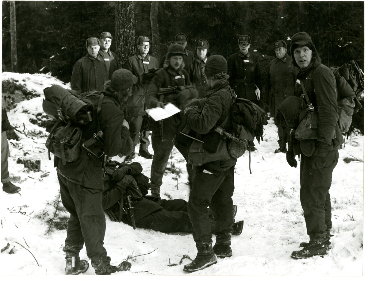 Titel: Soldater och officerare rastar i snöklädd skog.