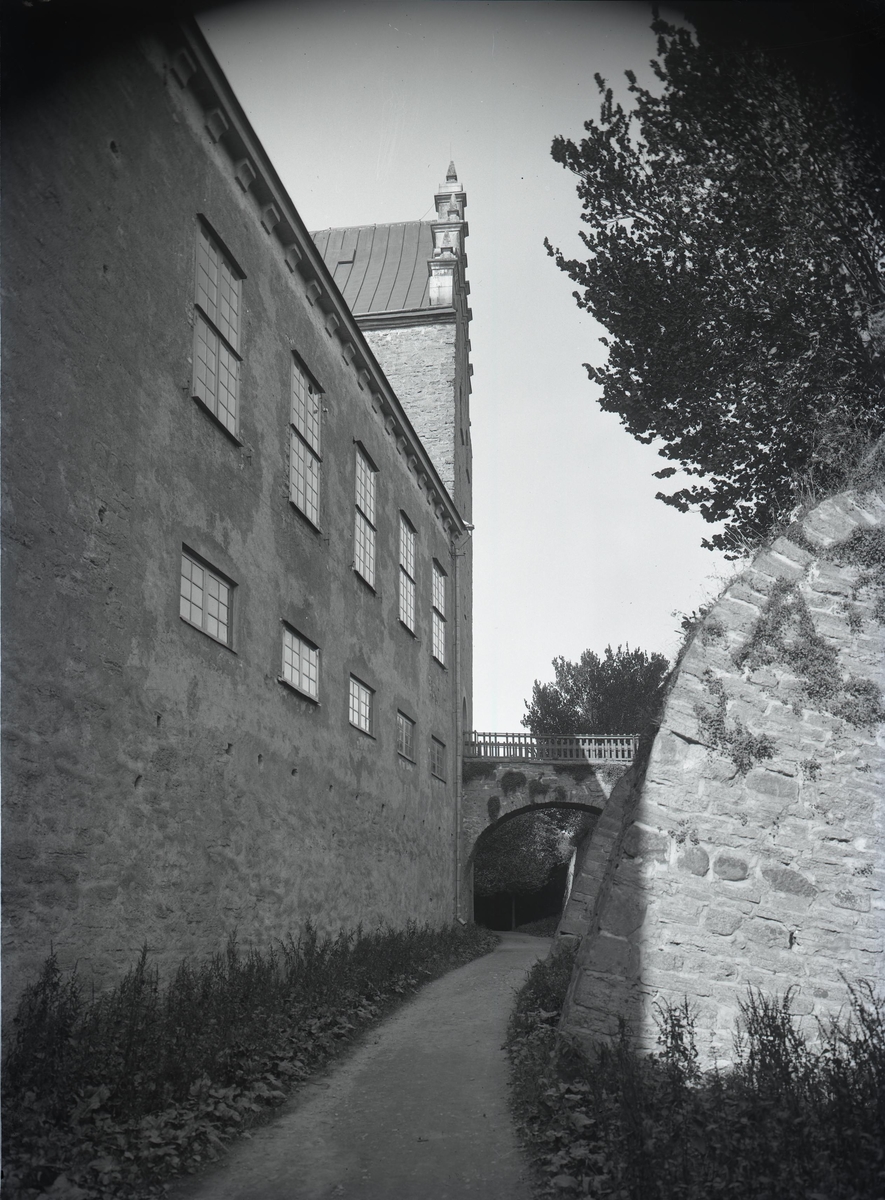 Kalmar slott. Yttre borggården innan gångbron till landshövdingens trädgård togs bort.