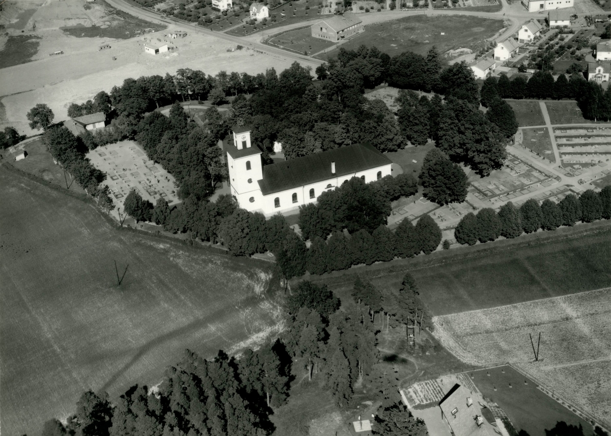 Flygfoto över Gamleby kyrka. Uppförande hela kyrkan 1832-1833.