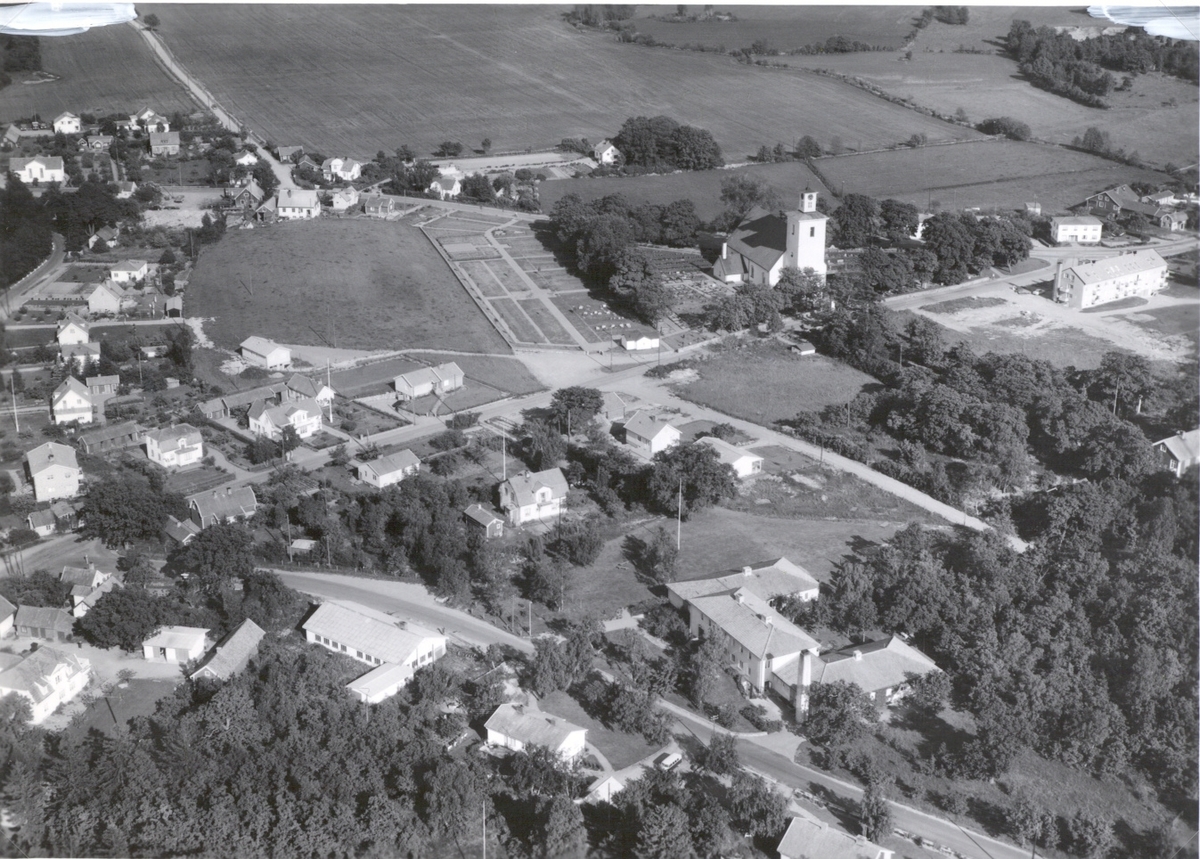 Flygbild över Rockneby med Ryssby kyrka i centrum.