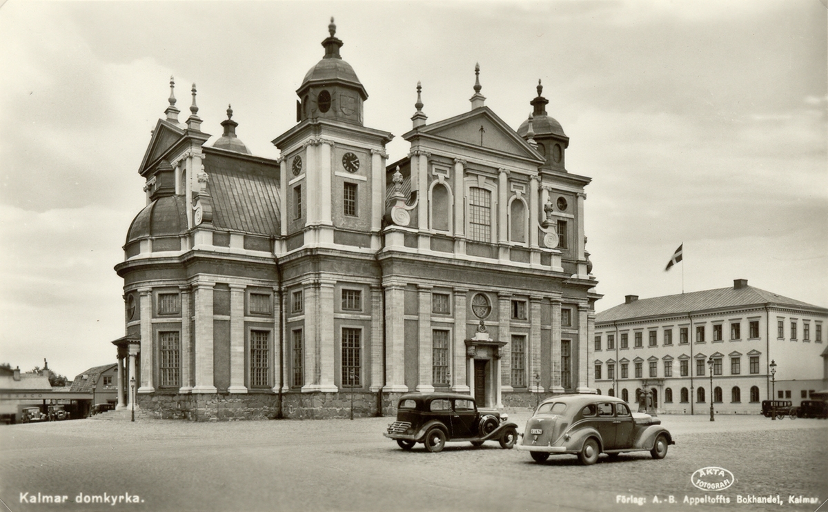 Vykort på Kalmar domkyrka, den dominerande stilepoken exteriört och interiört är barock. Uppförande mellan 1660-1703.