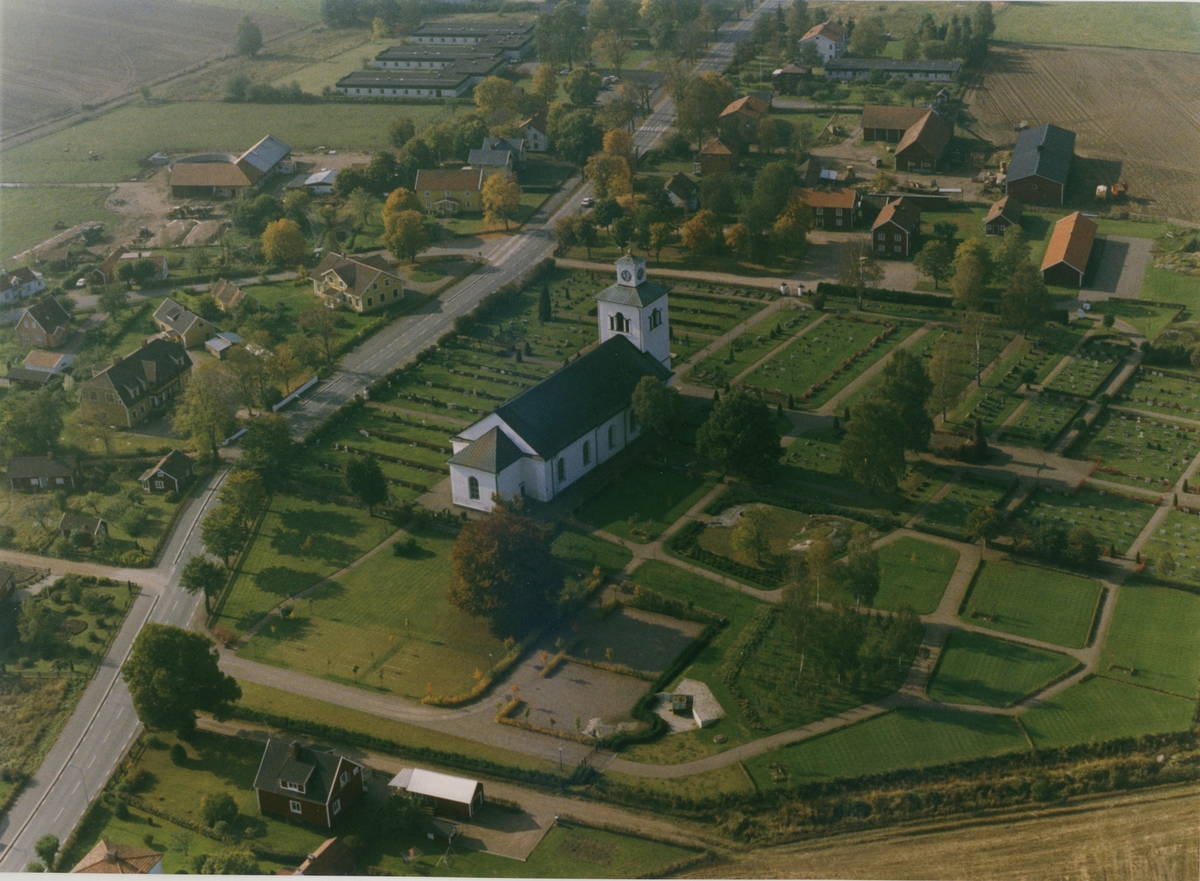 Flygfoto över Målilla kyrka, som byggdes i nyklassicistisk stil mellan 1820-1822.
