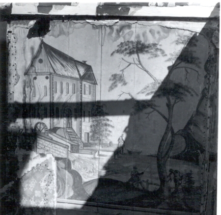 Väggmålningar i trappan till ett 1947 rivet hus vid Södra Långgatan. Grått i grått, på papper klistrat på virket. Överförda till museet.