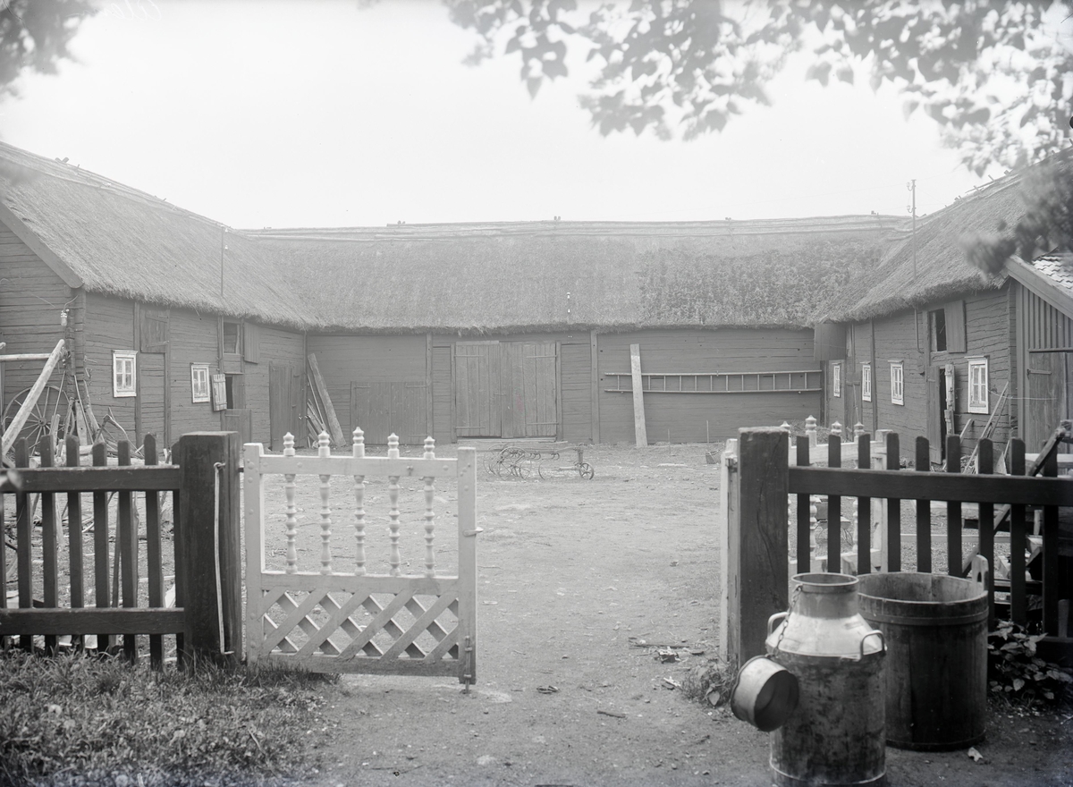 Tresidigt inbyggd ladugård i skiftesverk och med bundet halmtak.