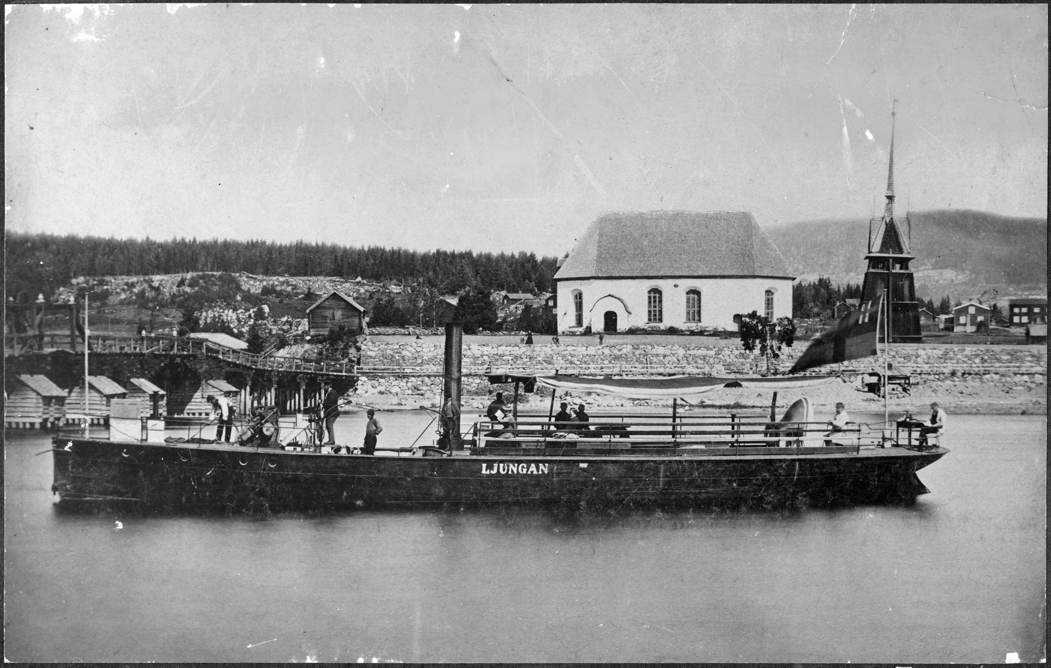 Kyrkan, klockstapeln och bron. Foto taget före 1881.