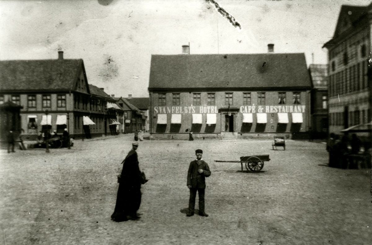 Vy från Stortorget mot kv. Bryggaren (Stadshotellet), till vänster kv. Magistern, till höger kv. Rådmannen.