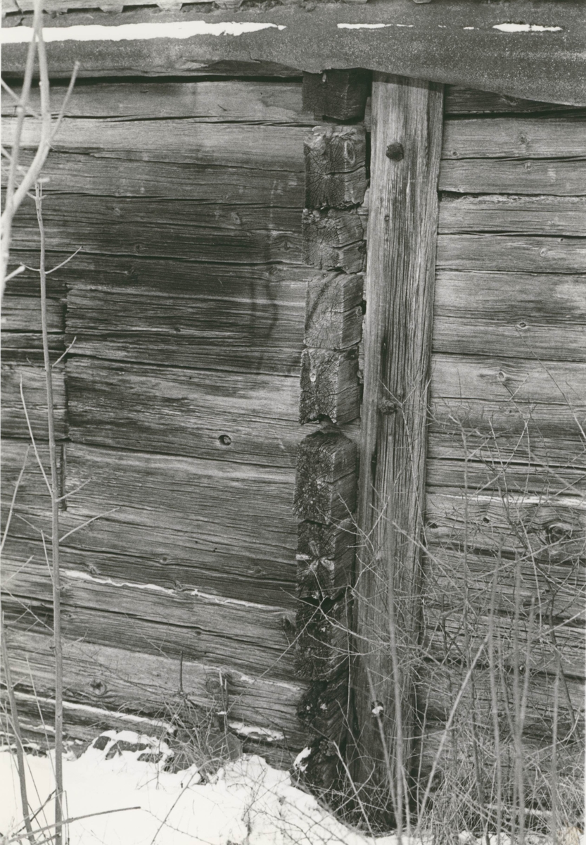 Titel: Närbild av en korsknutad, liggtimrad stuga i Högatorp.