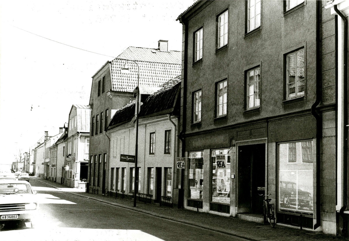 Fältskären 5 och 6, mot Ölandsgatan. Butik med skyltfönster till höger.