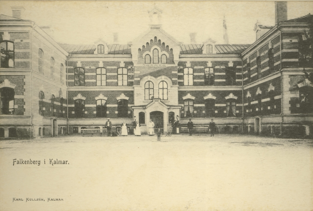 Vykort med motiv från Falkenbergshemmet med personal.