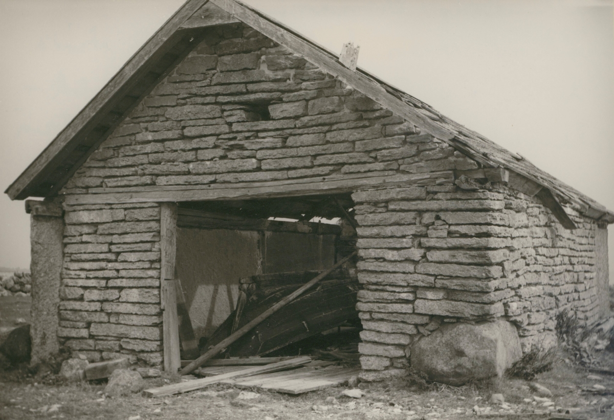 Sjöbodar av kalksten. Sätteka av gammal typ. I bakgrunden fiskefyren.