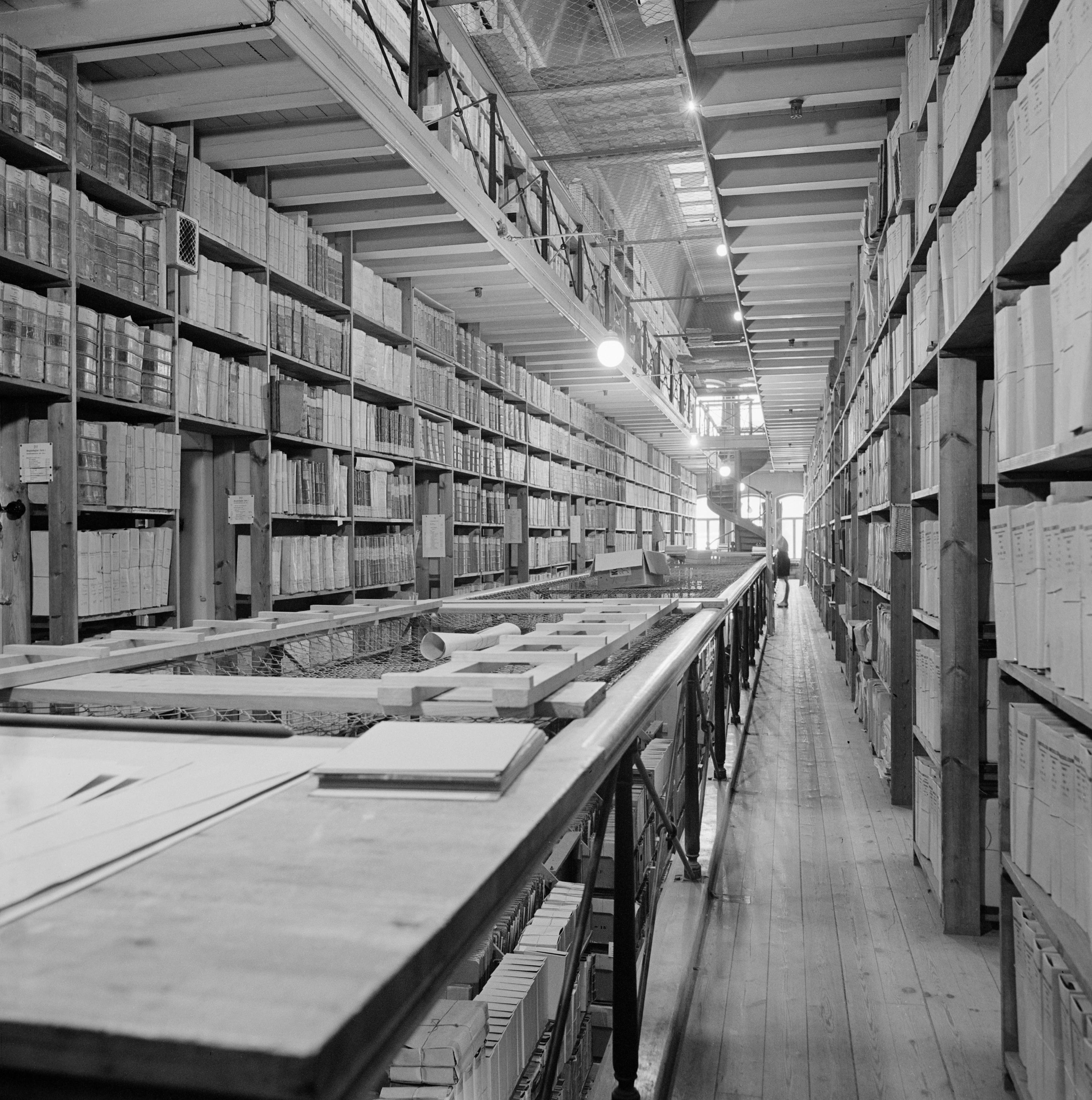 Ljusgården, centralrummet. Arkivalier på hyllor. Fängelset uppfördes 1895-1897 och verksamheten lades ner 1924. Från 1925 användes byggnaden som arkivdepå för Riksarkivet. Byggnaden revs 1968.