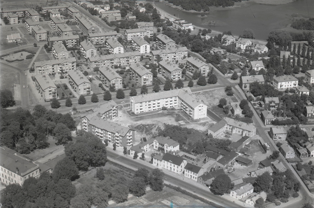 Titel: Vy över Malmen kvarteren Rockan, Hälleflundran och Rödingen. Mitt i bilden går Erik Dahlbergs väg.