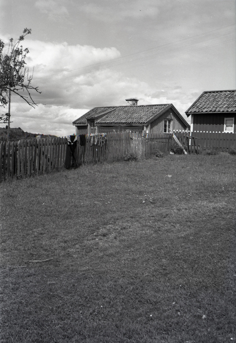 Magnussons gamla stuga. En ryggåsstuga bakom staketet.