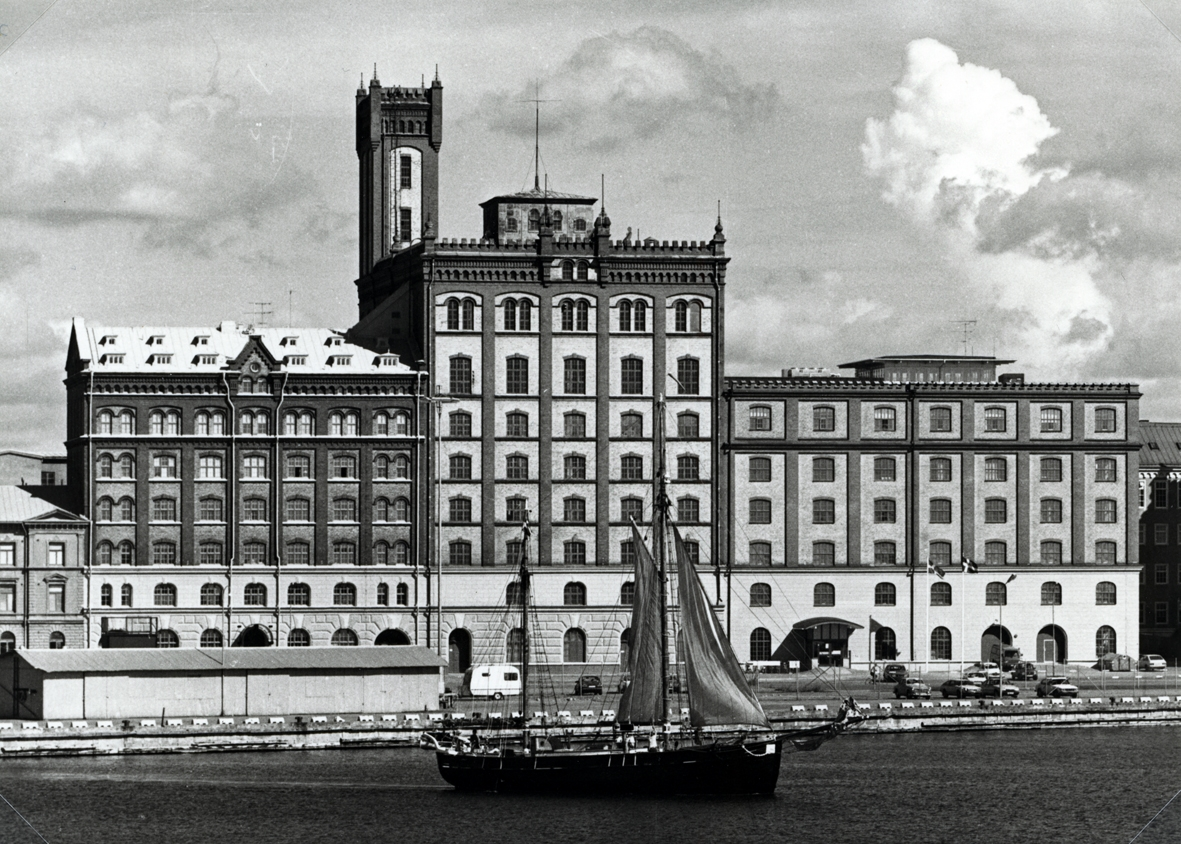 Ångkvarnen i Kalmar med ett fartyg framför.