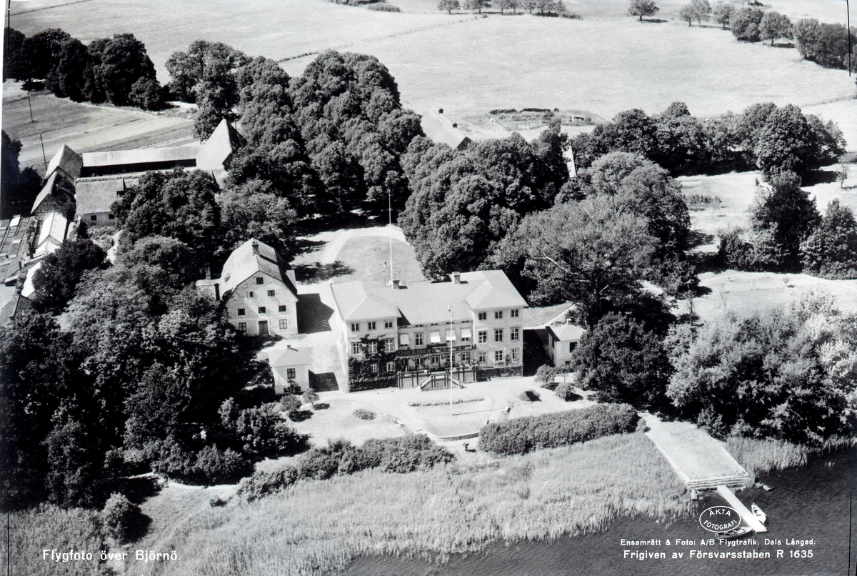 Titel: Vy över Björnö herrgård. Björnö Slott ligger naturskönt vid Kalmarsund bara 10 minuter norr om Kalmar. Gården har anor från 1300-talet och dagens huvudbyggnad byggdes på 1850-talet.