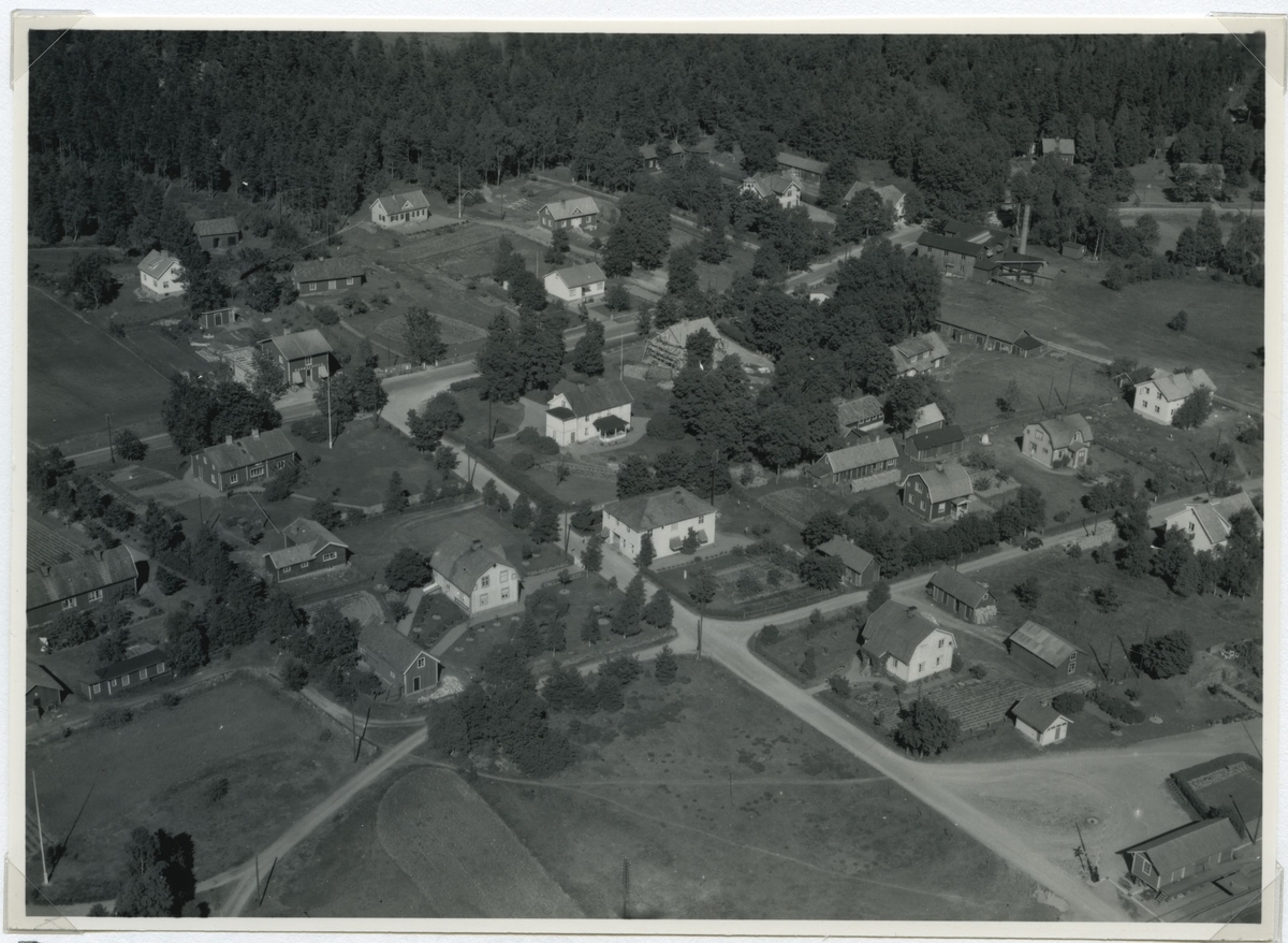 Flygfoto över Hälleberga by med villor och skog.