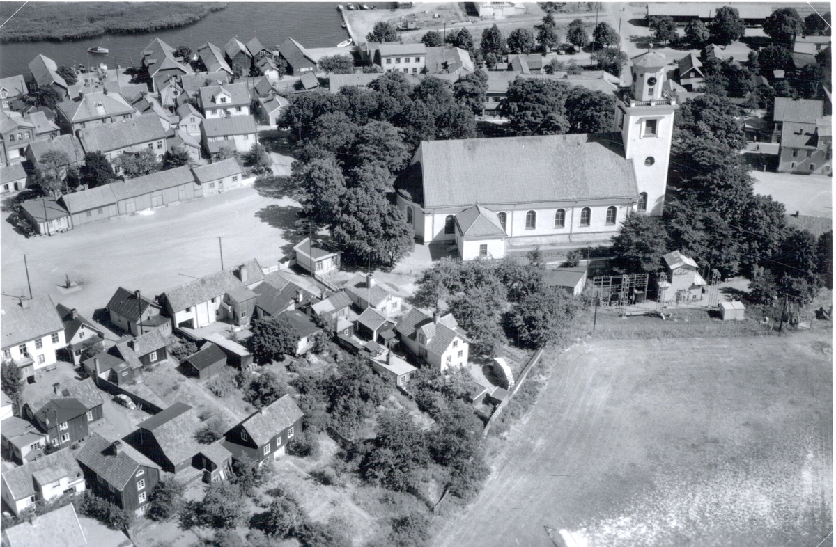 Flygbild av Mönsterås med kyrkan vid torget och villor och bostadshus, Kalmarsund i bakkant på bilden.