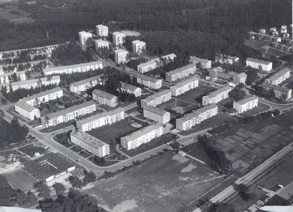 Flygfoto över flerfamiljshus i Funkabo, Kalmar.