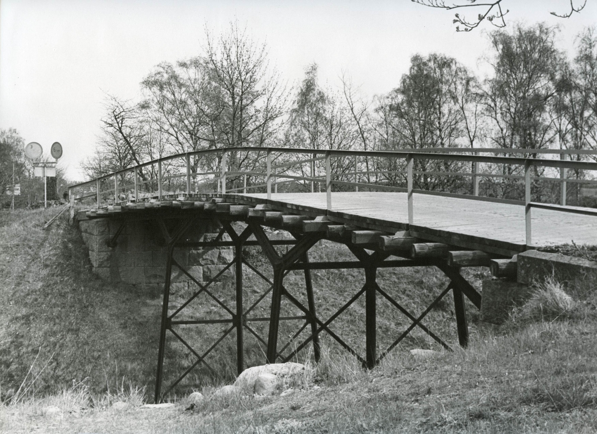 Bro över järnvägen vid Åsarna. Balkbro med stativ av hopfogade räler i tre spann.