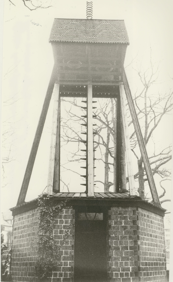 Klockstapeln vid kyrkan i Ankarsrum. Foto taget från kyrkan. En stege finns på baksidan av klockstapeln. Ännu mindre synlig med nytt smäckare utseende.