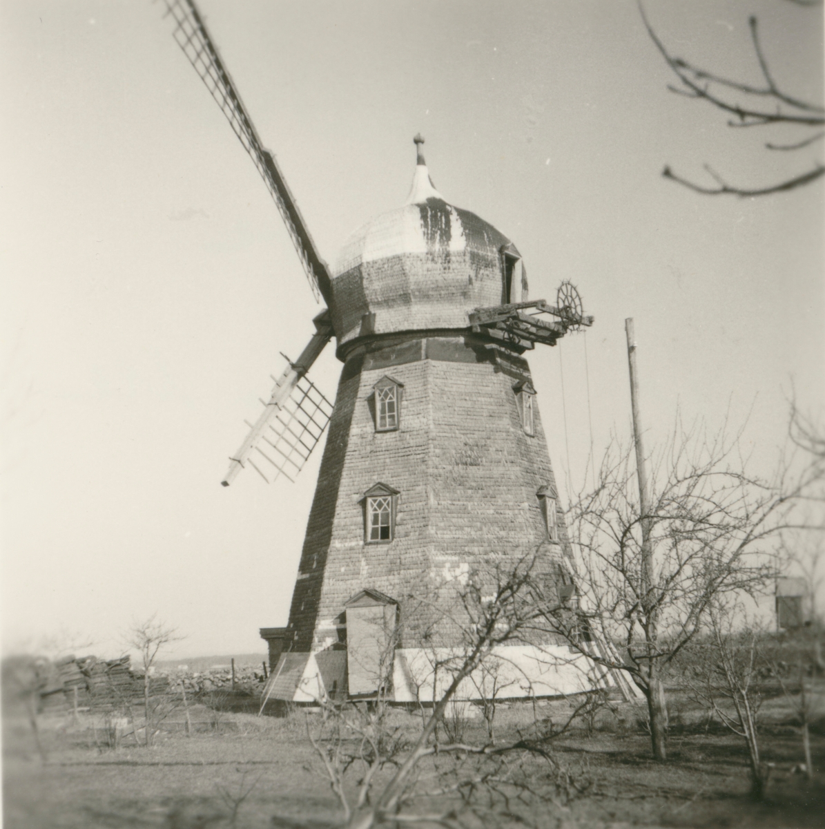 Holländsk kvarn strax ovanför vägskälet mellan stora landsvägen och Färjestadsvägen. Under reparation våren 1957. Vid en senare reparation har spånet på taket ersatts med plåt.